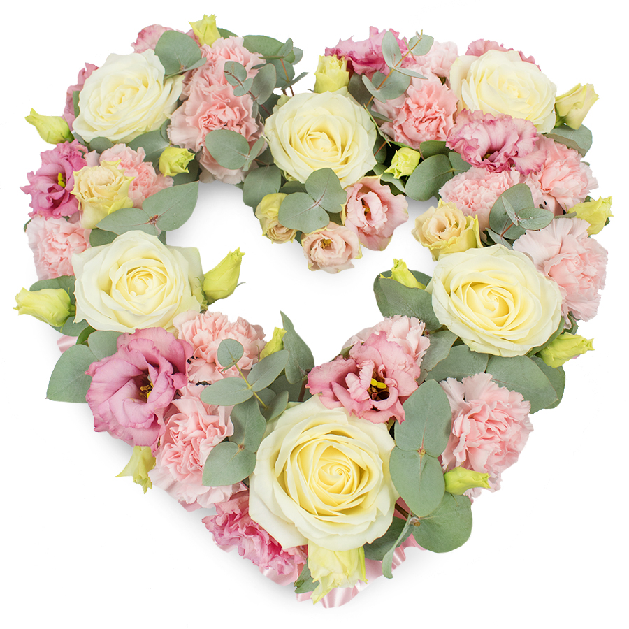 Convey your heartfelt condolences with our beautiful open heart sympathy bouquet. This elegant arrangement features white roses, pink carnations, pink lisianthus, and eucalyptus, all hand-selected to ensure maximum freshness and visual appeal.